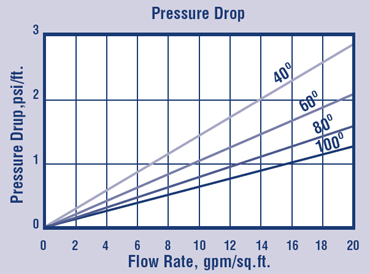 A. Pressure Drop: The graph above shows the expected pressure loss per foot of bed depth as a function of flow rate, at various temperatures.